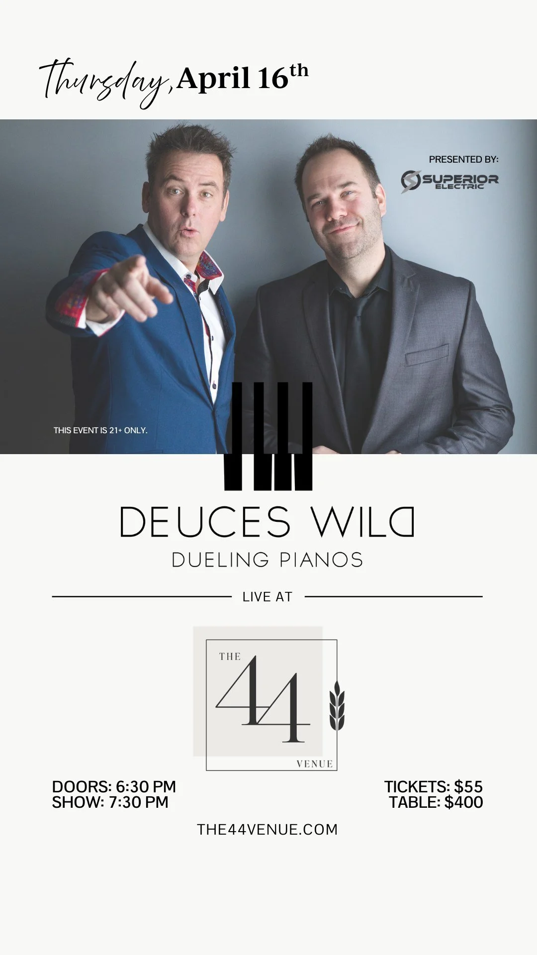 Get ready for a high-energy night of music, comedy, and nonstop audience interaction when Deuces Wild Dueling Pianos takes the stage at The 44!